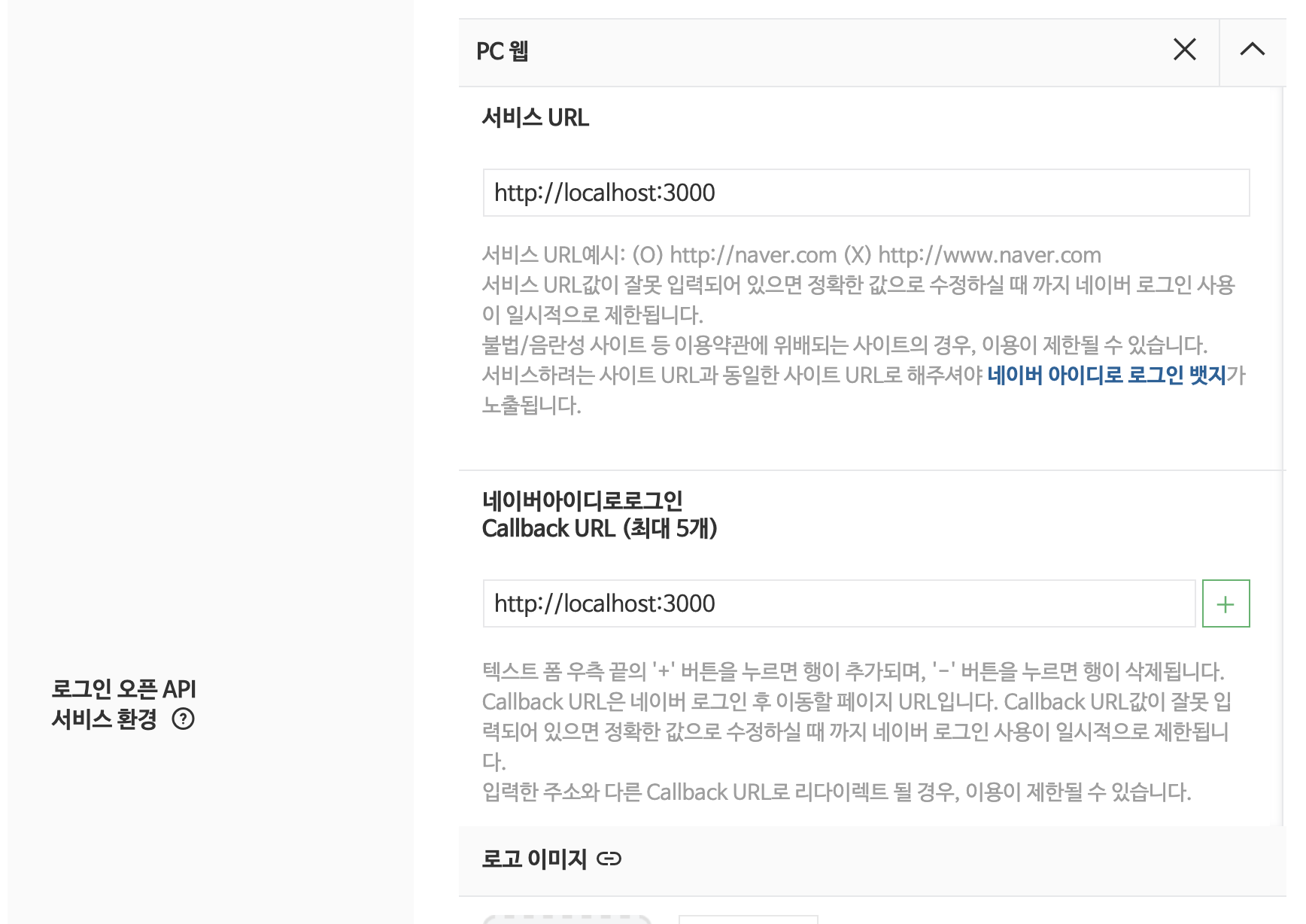- API를 사용할 url을 적어주고, 네이버 아이디로 로그인 시 Callback URL도 적어준다.