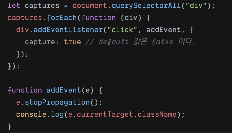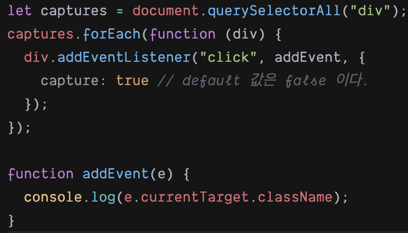 js addEventListener( ) API에서 옵션 객체에 capture: true를 설정해주면 된다. 그러면 해당 이벤트를 감지하기 위해 이벤트 버블링과 반대 방향으로 탐색한다.