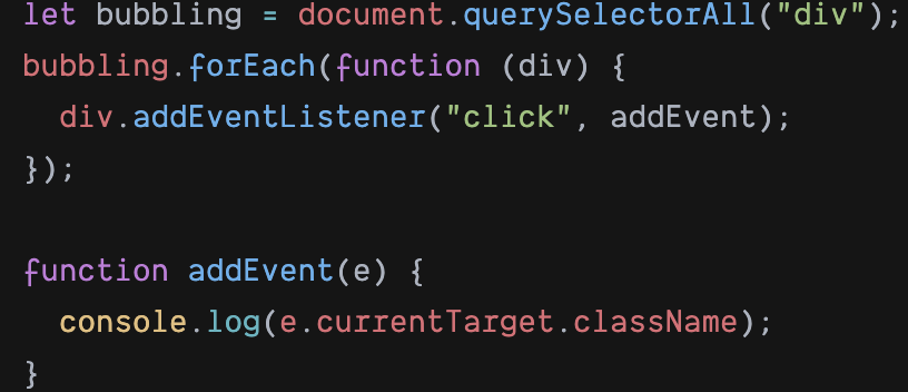 위의 코드는 세 개의 div 태그에 모두 클릭 이벤트를 등록하고 클릭했을 때 addEvent 함수를 실행시키는 코드이다.