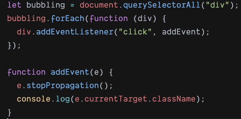 ◎ event.stopPropagation( ) API는 해당 이벤트가 전파되는 것을 막는다. 따라서 이벤트 버블링의 경우에는 클릭한 요소의 이벤트만 발생시키고 상위 요소로 이벤트를 전달하는 것을 방해합니다. 그리고 이벤트 캡쳐의 경우에는 클릭한 요소의 최상위 요소의 이벤트만 동작시키고 하위 요소들로 이벤트를 전달하지 않는다.