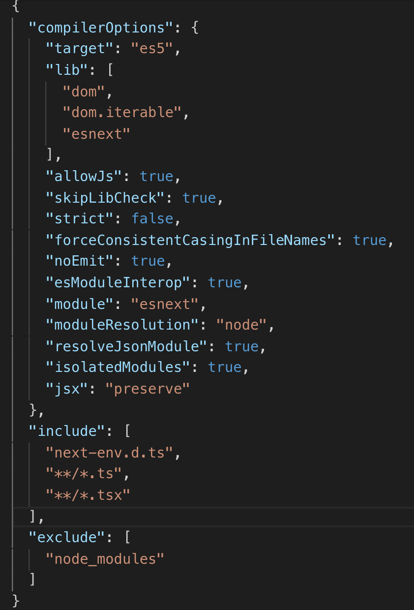 원래 빈 파일이었던 tsconfig.json은 다음과 같이 설정이 된다.