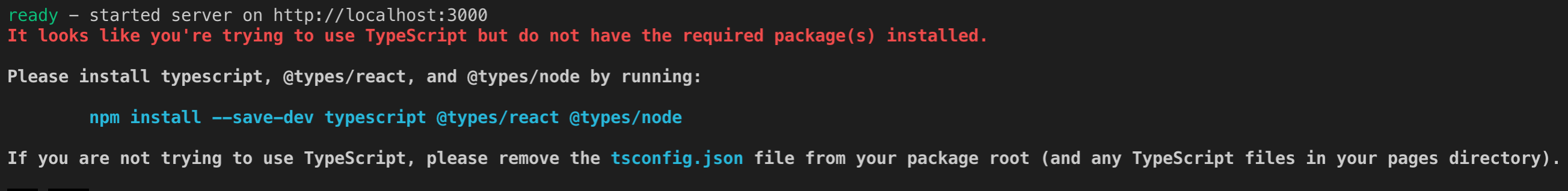 npm install --save-dev typescript @types/react @types/node설치하고 다시 실행하면 잘 실행된다.