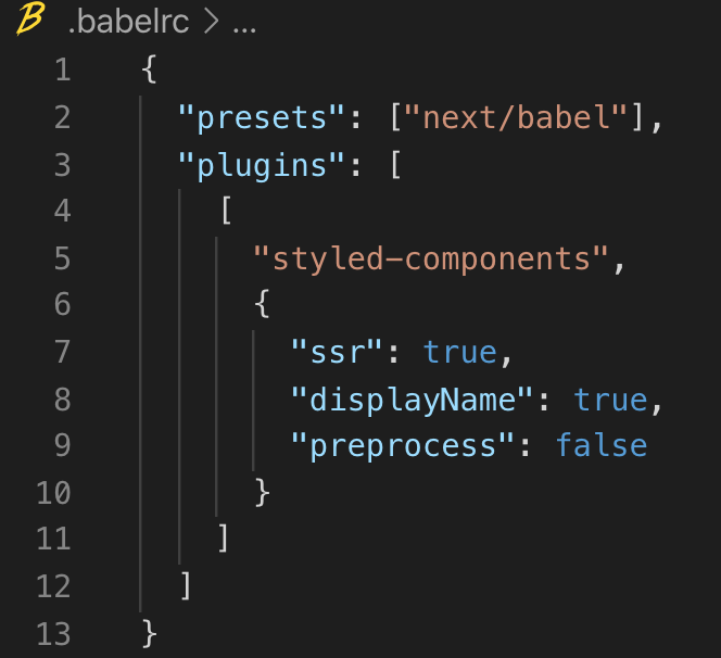 npm install --save-dev babel-plugin-styled-componentsnpm을 설치하고 루트 경로에 .babelrc 파일을 만들고 설정을 다음과 같이 한다.