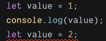 let value = 1; 을 선언하고, 다시 let value = 2; 로 재선언 하였다. 코드를 보면 빨간 줄로 밑줄이 그어져 있다.