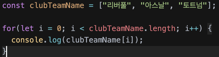 i < clubTeamName.length; 는 i 값이 clubTeamName 배열의 길이보다 작을 때까지 반복하겠다는 구문이다.