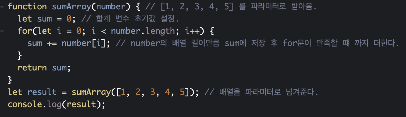 ◎ numbers 배열을 파라미터로 받아서 원소들의 총합을 구하는 함수를 구현해보자.