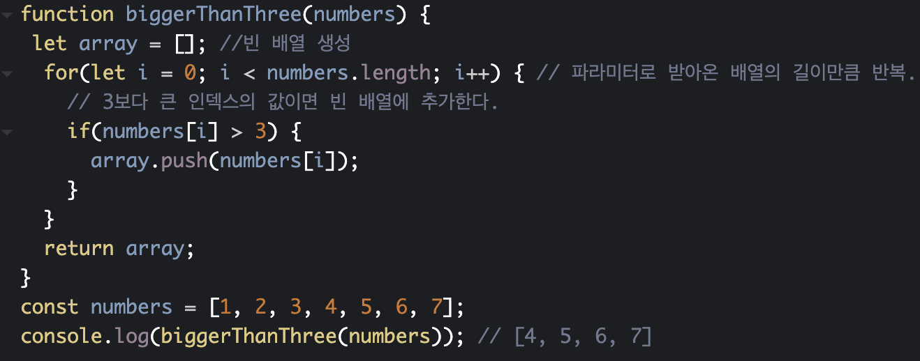 ◎ 숫자로 이루어진 배열이 주어졌을 때, 해당 숫자 배열 안에 들어있는 숫자 중 3보다 큰 숫자로만 이루어진 배열을 새로 만들어보자.