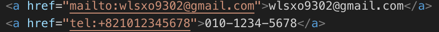a태그를 사용할 때 밑에 코드와 같이 작성하면 이메일, 휴대폰으로 바로 연결해줄 수 있게 링크를 걸어줄 수 있다는 점이다.