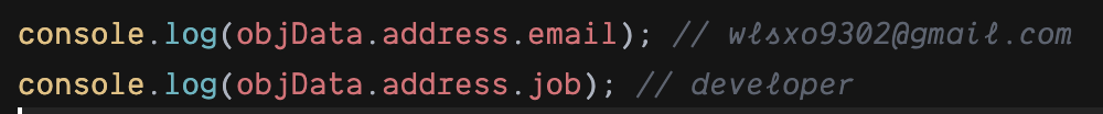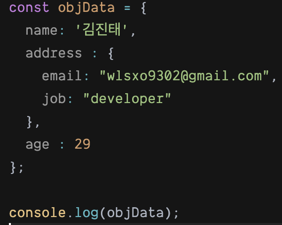 console objData 객체 안에 address라는 프로퍼가 있고 그의 값은 객체로 되어있다.