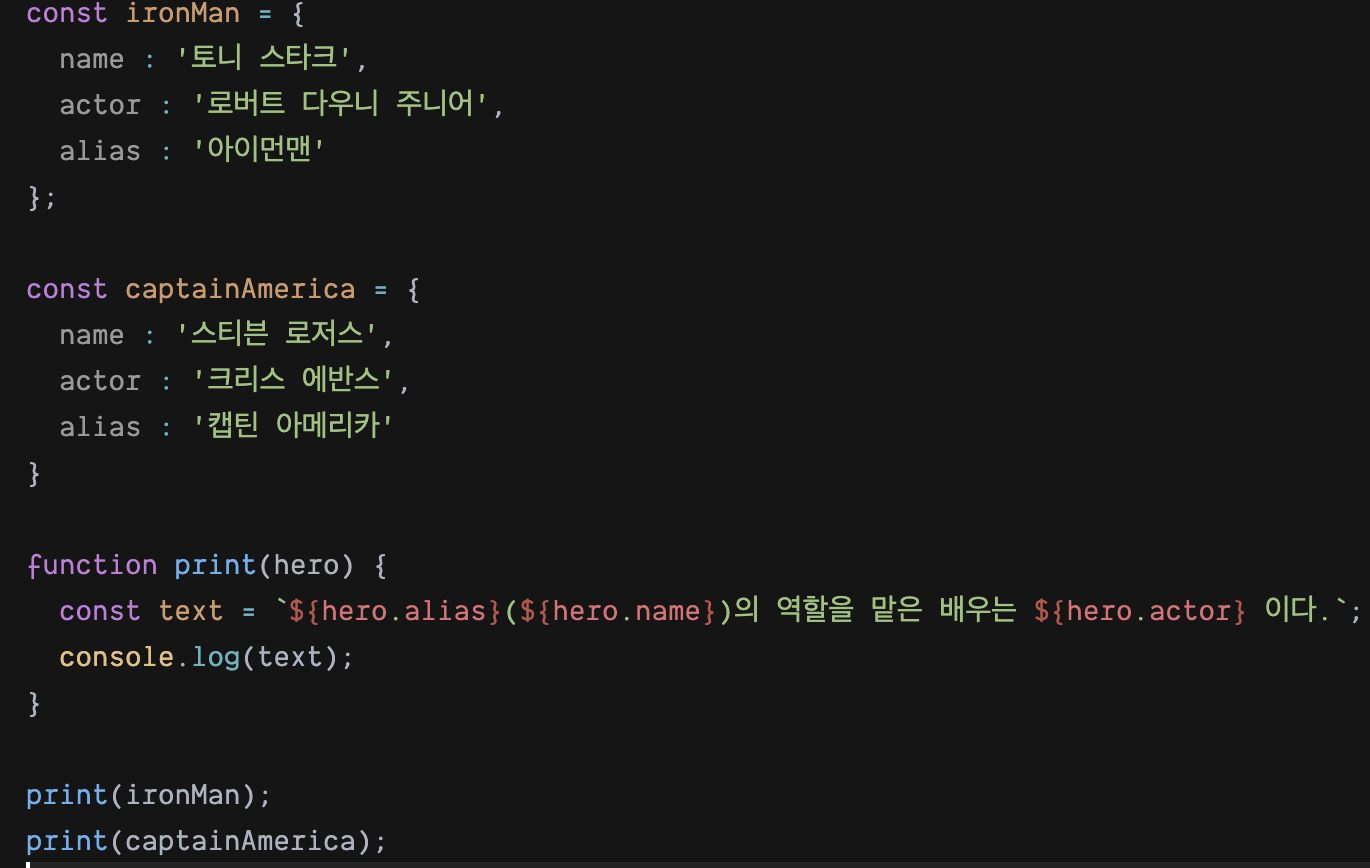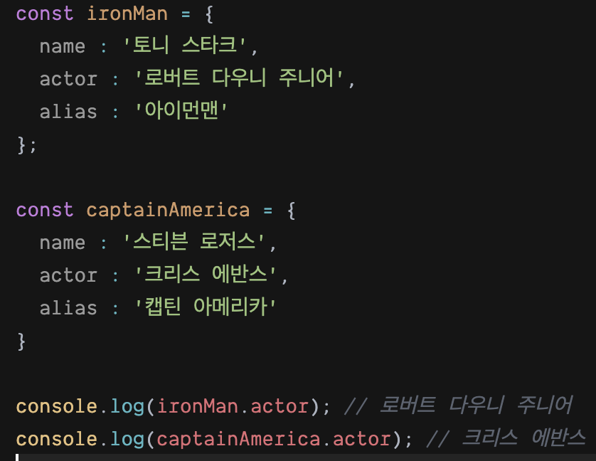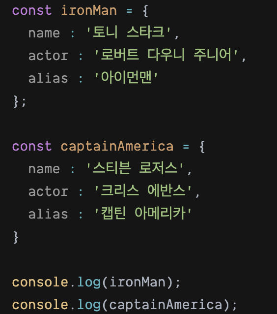 hero는 ironMan과 captainAmerica 객체이기 때문에 hero.프로퍼티명 으로 그에 해당하는 값을 사용한다.