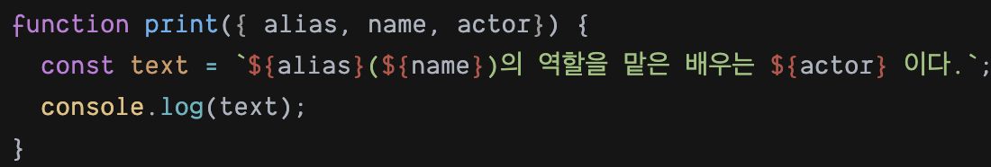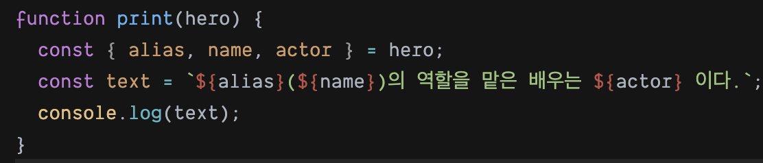 ◎ 위의 코드에서 print 함수를 보면 파라미터로 받아온 hero 내부의 값을 조회할 때마다 hero. 를 입력하고 있는데, 객체 비구조화 할당이라는 문법을 사용하면 코드를 더욱 짧고 보기 좋게 작성할 수 있다.