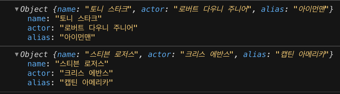 console을 이용하여 ironMan 객체와 captainAmerica 객체를 출력했을 때 다음과 같은 결과가 나옵니다.