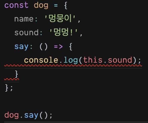 code 하지만 객체 안에 함수를 넣을 때, 화살표 함수(arrow function)로 선언한다면 제대로 작동하지 않는다.