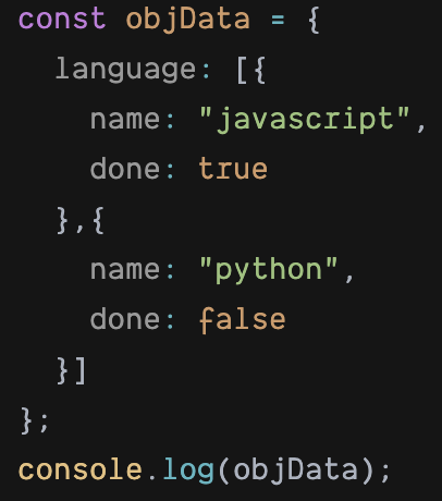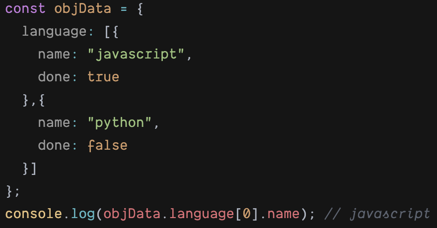 objData안에 language 프로퍼티에 접근하고, language 프로퍼티는 배열 형태로 되어있기 때문에 name이 javascript로 되어있는 0번째 인덱스에 접근하여 가져오면 된다.