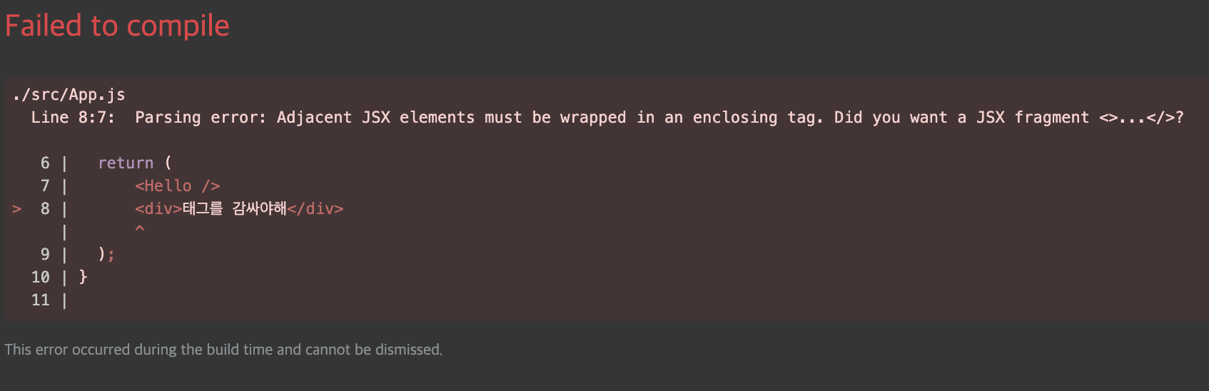 App.js <Hello /> 컴포넌트와 <div>와 같은 위치에 있다. 이런 코드는 오류를 발생하게 된다.