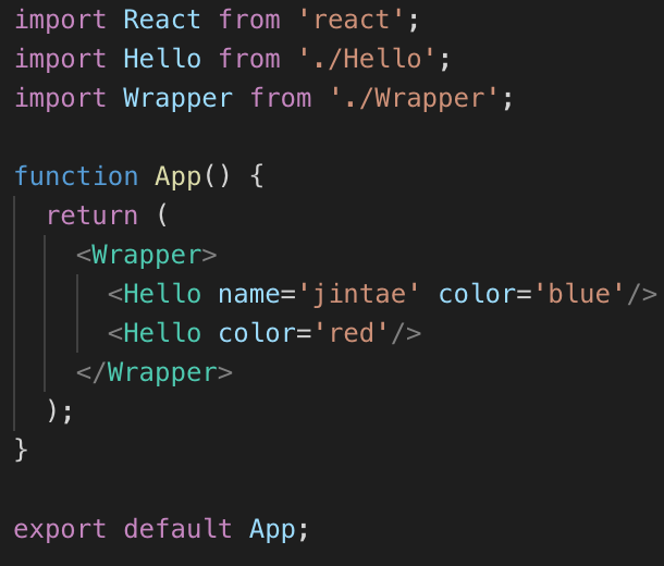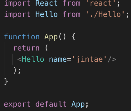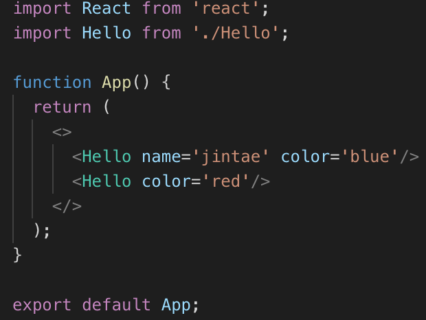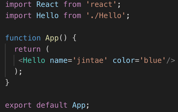 ◎ 예를 들어서, App 컴포넌트에서 Hello 컴포넌트를 사용할 때 name이라는 값을 전달해주고 싶다고 해보자.