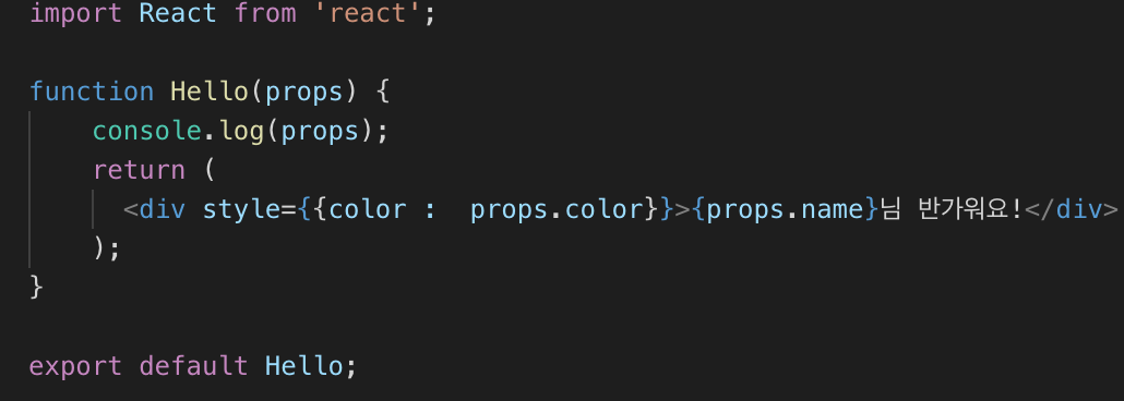 props는 객체 형태로 전달되며, 만약 name 값을 조회하고 싶다면, props.name을 조회하면 된다.