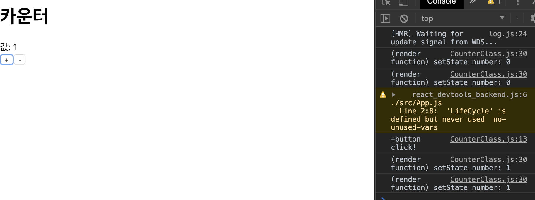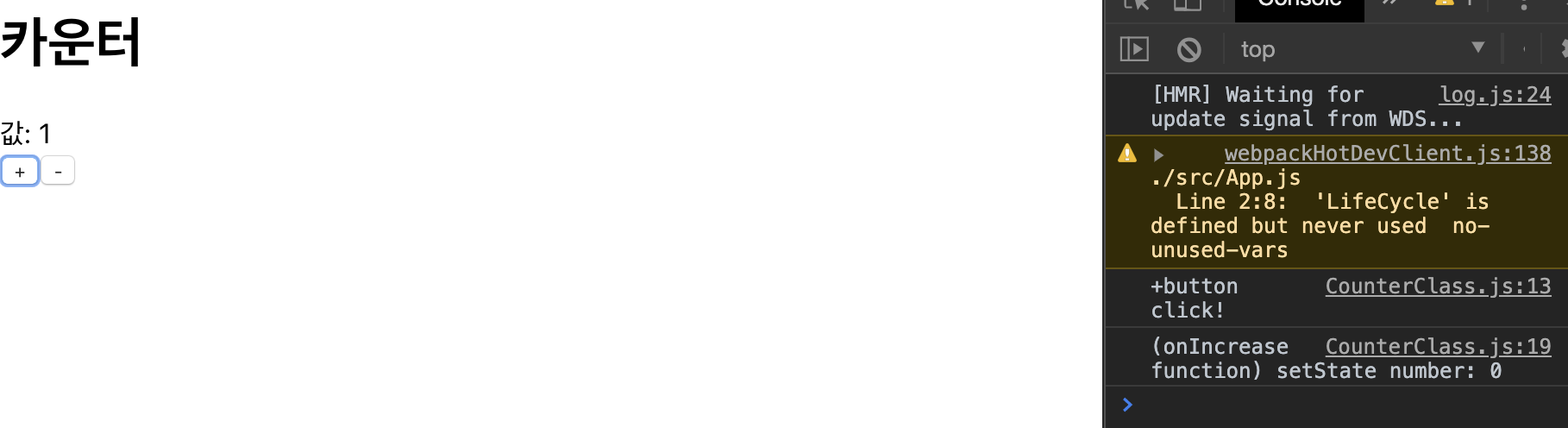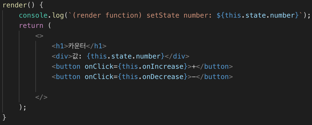 render() { return ( <> <h1>카운터</h1> <div>값: {this.state.number}</div> <button onClick={this.onIncrease}>+</button> <button onClick={this.onDecrease}>-</button> </> ); }버튼이 클릭되면 설정한 함수가 각각 호출되도록 설정하였다.