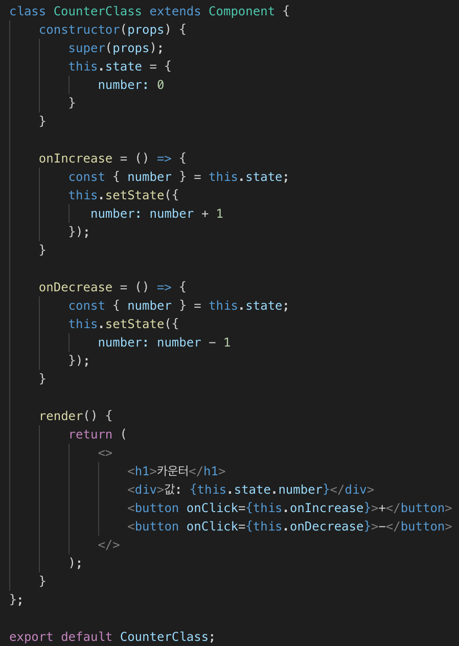 onIncrease = () => { const { number } = this.state; this.setState({ number: number + 1 }); } onDecrease = () => { const { number } = this.state; this.setState({ number: number - 1 }); }일반 함수로 작성해도 되지만 나중에 버튼에서 클릭이벤트가 발생했을 때, this가 undefined로 나타나서 제대로 처리되지 않게 된다.