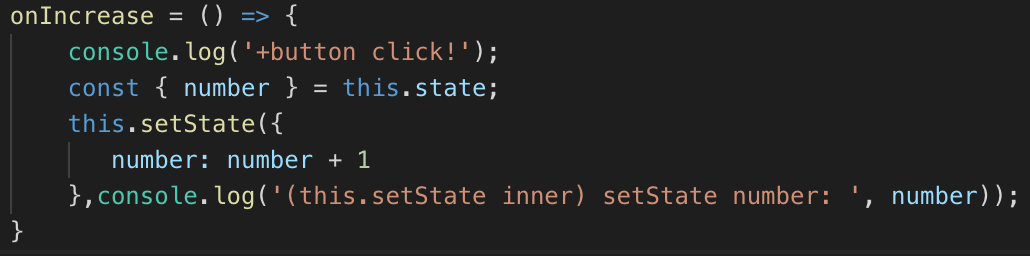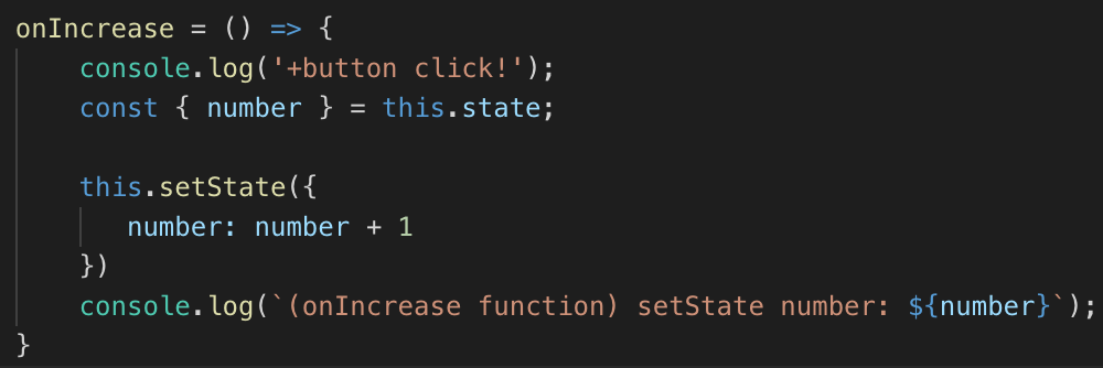 const { number } = this.state; this.setState({ number : number + 1 });훨씬 더 깔끔해진 코드를 확인할 수 있다.