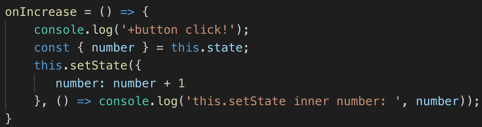 onIncrease() { const { number } = this.state; this.setState = ({ number: number + 1 }) }