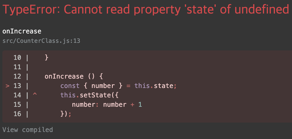 onIncrease() { const { number } = this.state; this.setState = ({ number: number + 1 }) }일반 함수로 사용했을 때 +버튼을 클릭하면 오류를 보게 될 것이다.