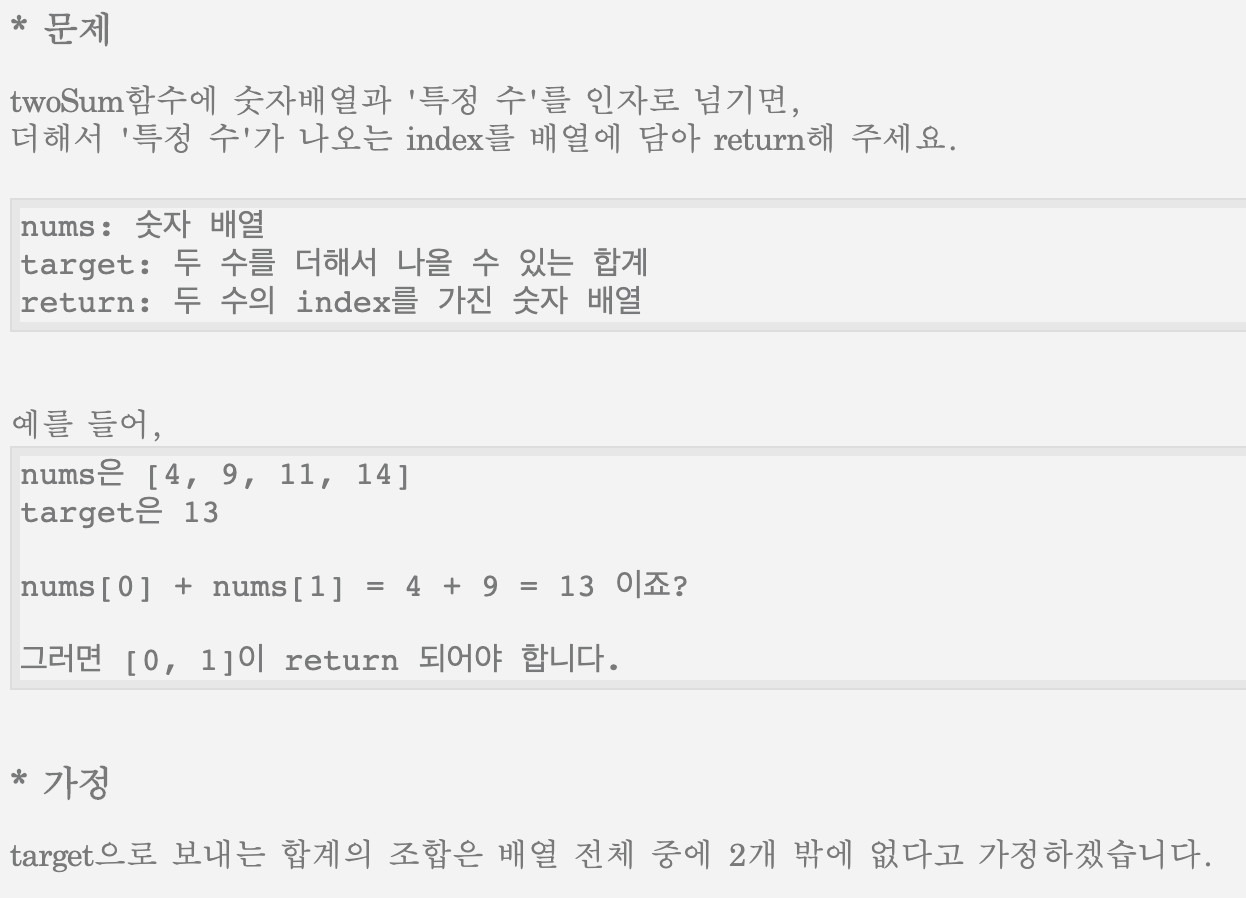 const twoSum = (nums, target) => { let array = []; for(let i = 0; i < nums.length; i++) { for(let y = 0; y < nums.length; y++){ if(nums[i] + nums[y] === target) { array.push(i , y); return array; } } } } twoSum([4, 9, 11, 14], 13)'Develope > Algorithm' 카테고리의 다른 글