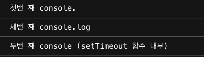 console.log 첫 번째 console이 실행되고 두 번째 console은 1초 뒤 실행되니까 세 번째 console.log가 먼저 나온 뒤 setTimeout() 내부에 있는 console이 찍힌다.