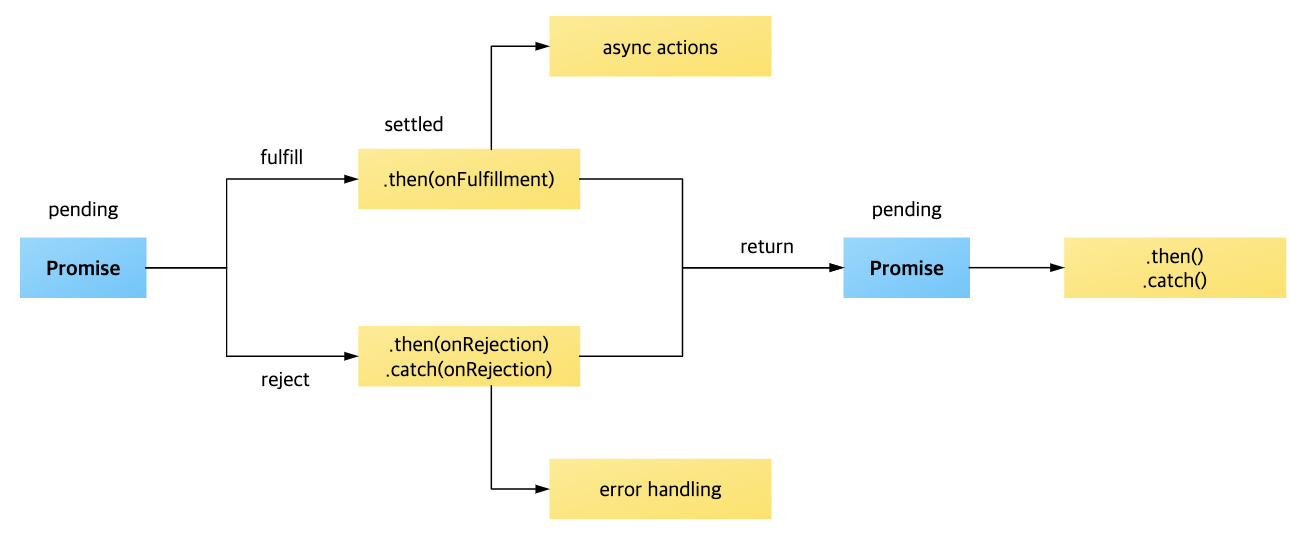 - Fulfilled(이행): 비동기 처리가 완료되어 프로미스가 결과 값을 반환해준 상태
