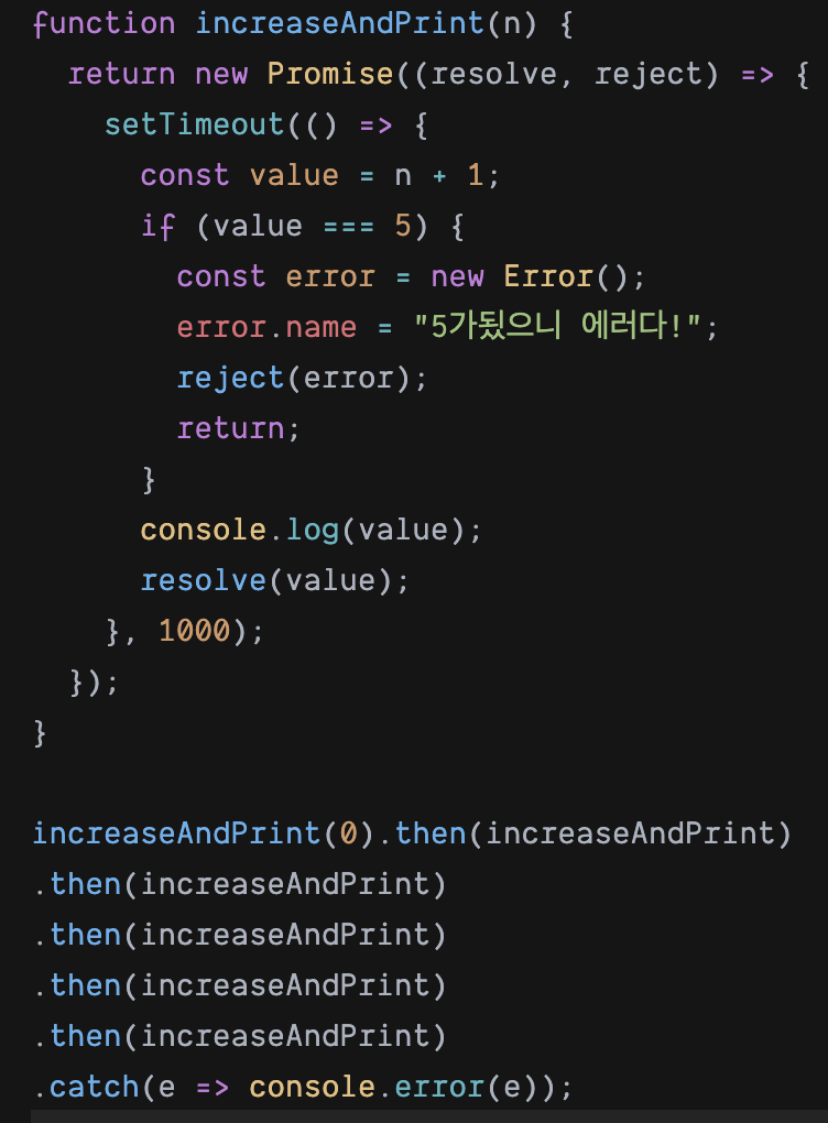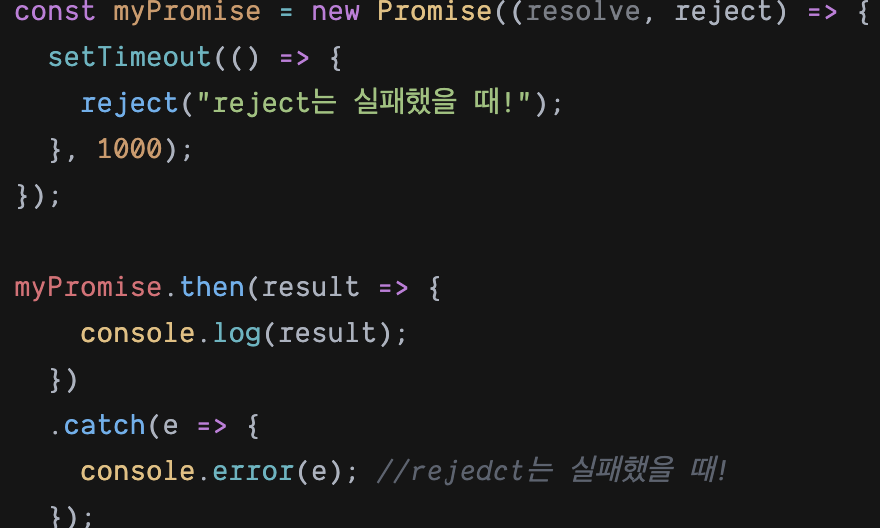 reject: 실패했을 때 reject를 호출 할 때는 .catch( ) 키워드를 사용하여 실패했을 시 수행할 작업을 설정할 수 있다.