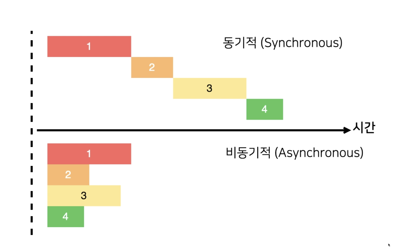 동기적은 1번이 끝날 때까지 2번을 시작하지 못한다. 1번이 끝나야 비로소 2번이 실행되고, 2번이 끝나야 3번을 시작할 수 있다.